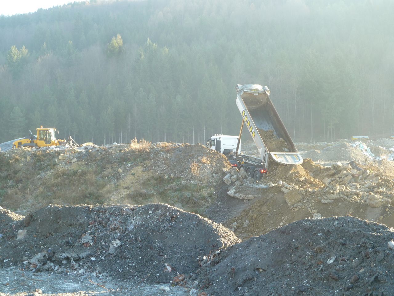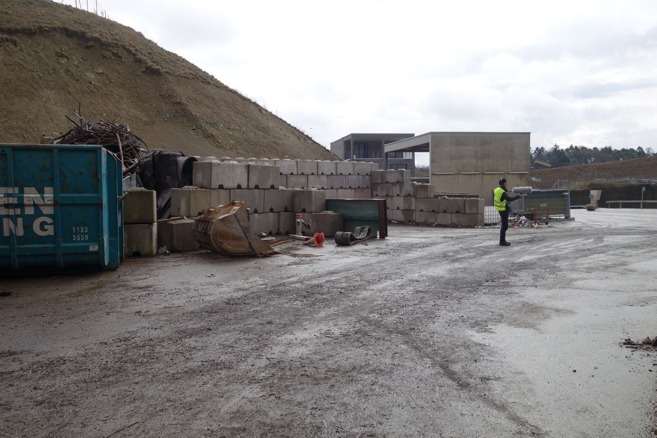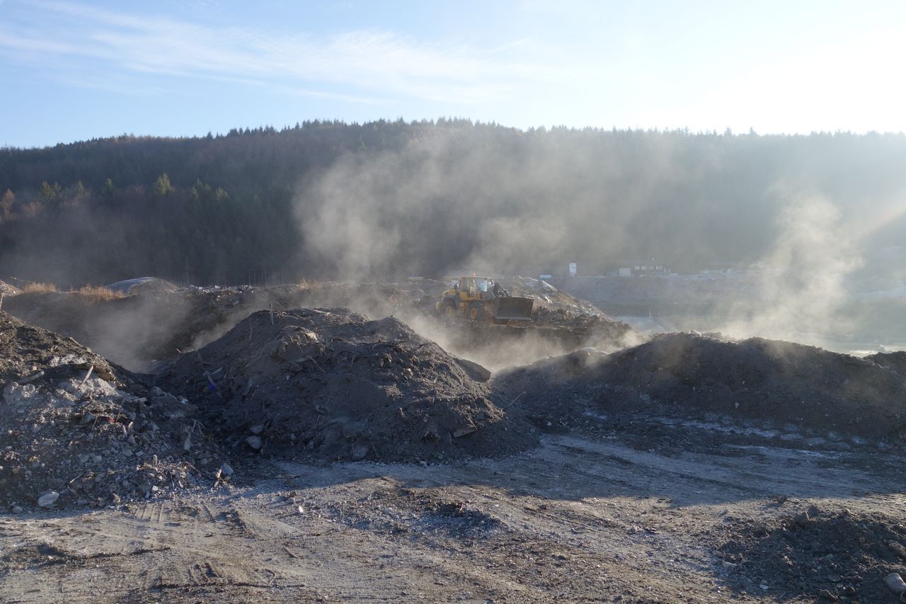 Deponie Elbisgraben Basel-Landschaft, Schweiz: Anlieferung von Schlackenmaterialien aus der KVA Basel; Extraktion von Metallen und Deponierung der gereinigten Schlacke.
