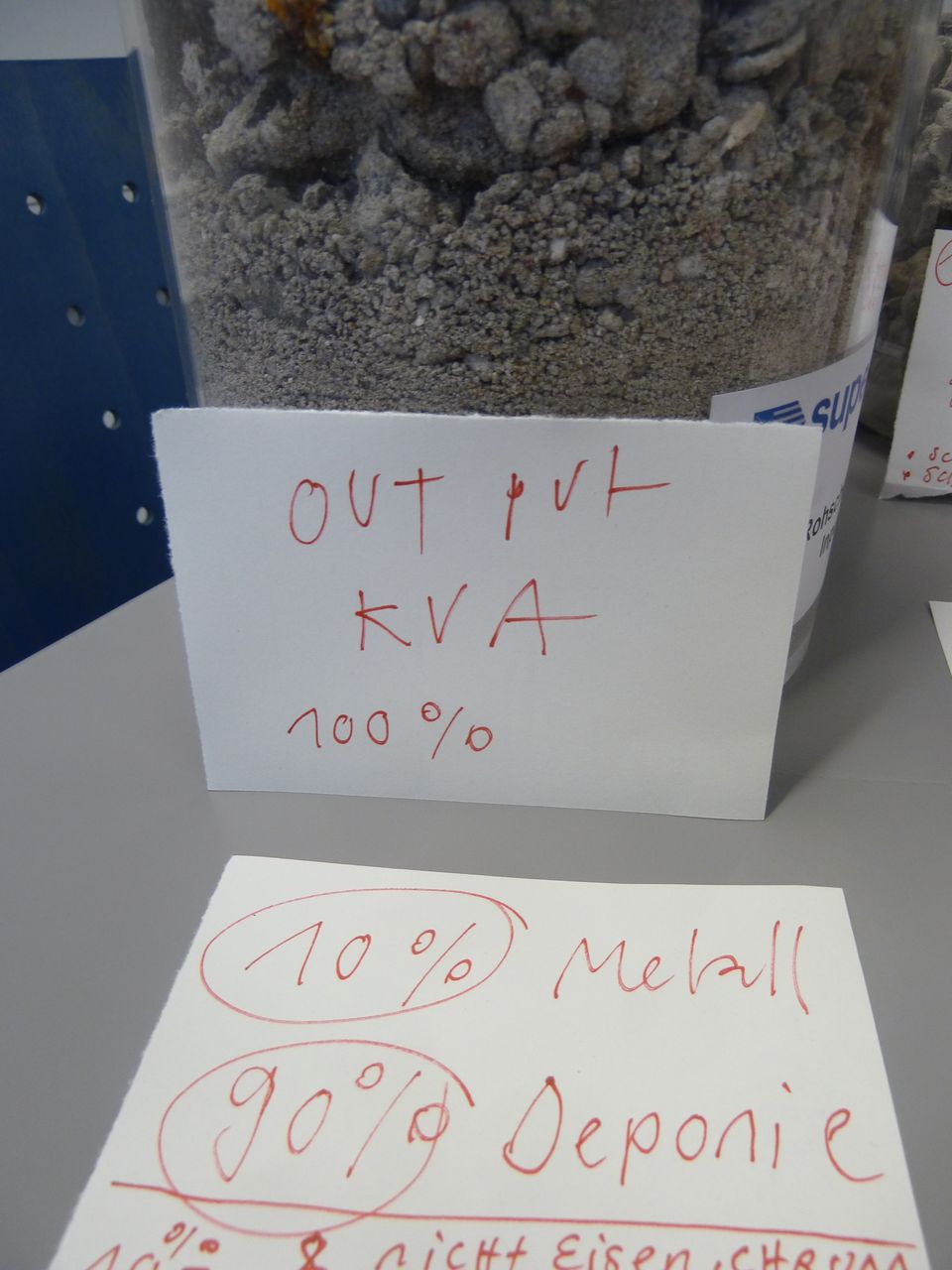 In der Schlacke sind 10% Metalle (Extrakte) und 90% Laststoffe enthalten, d.h. Schlackenmaterialien, die in der Deponie bleiben. Diese enthalten Aschen, mineralische Bestandteile, Salze, weshalb sie in der Schweiz nicht für die Weiterverwendung einsetzbar sind. In Holland und Belgien geschieht dies jedoch aus Mangel an Baumaterialien. Von den in der Schlacke enthaltenen 10% an Metallen sind 8% Eisenmetalle und 2% Nicht-Eisenmetalle wie Kupfer, Blei, Chrom, Nickel, Silber, Gold.