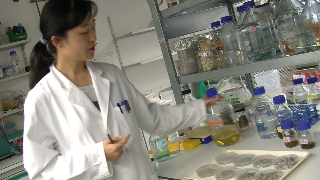 Labor Geomikrobiologie Universität Tübingen, Deutschland: Jing He, Mitarbeiterin des Forschungsteams von Andreas Kappler, extrahiert Metalle aus Schlacke, die bei der Kehrichtverbrennung übrig bleibt, mit Hilfe von Mikroorganismen aus dem vom Bergbau übersäuerten Rio Tinto in Spanien und aus einem kupferhaltigen Minengebiet in China.