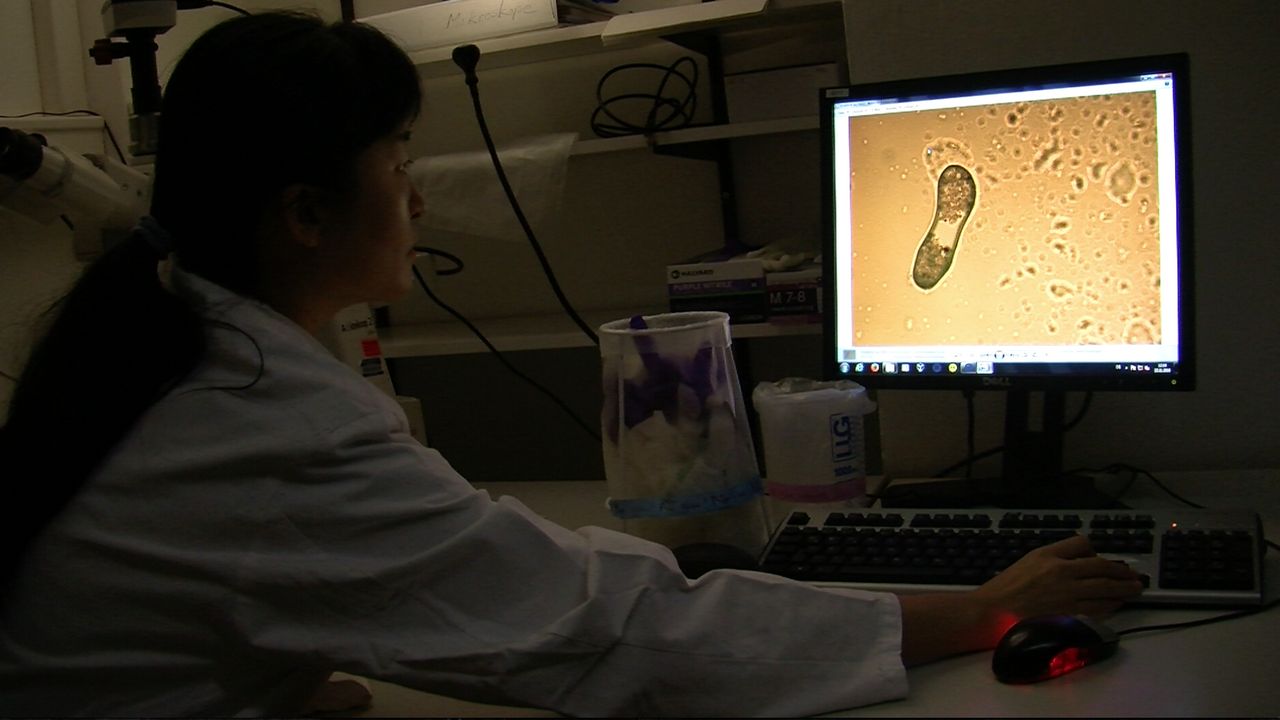 Bei unserem Besuch des Labors zeigt uns die Teammitarbeiterin Jing He die Versuchsanlagen sowie ihre visuelle Dokumentation der Mikroorganismen-Proben.